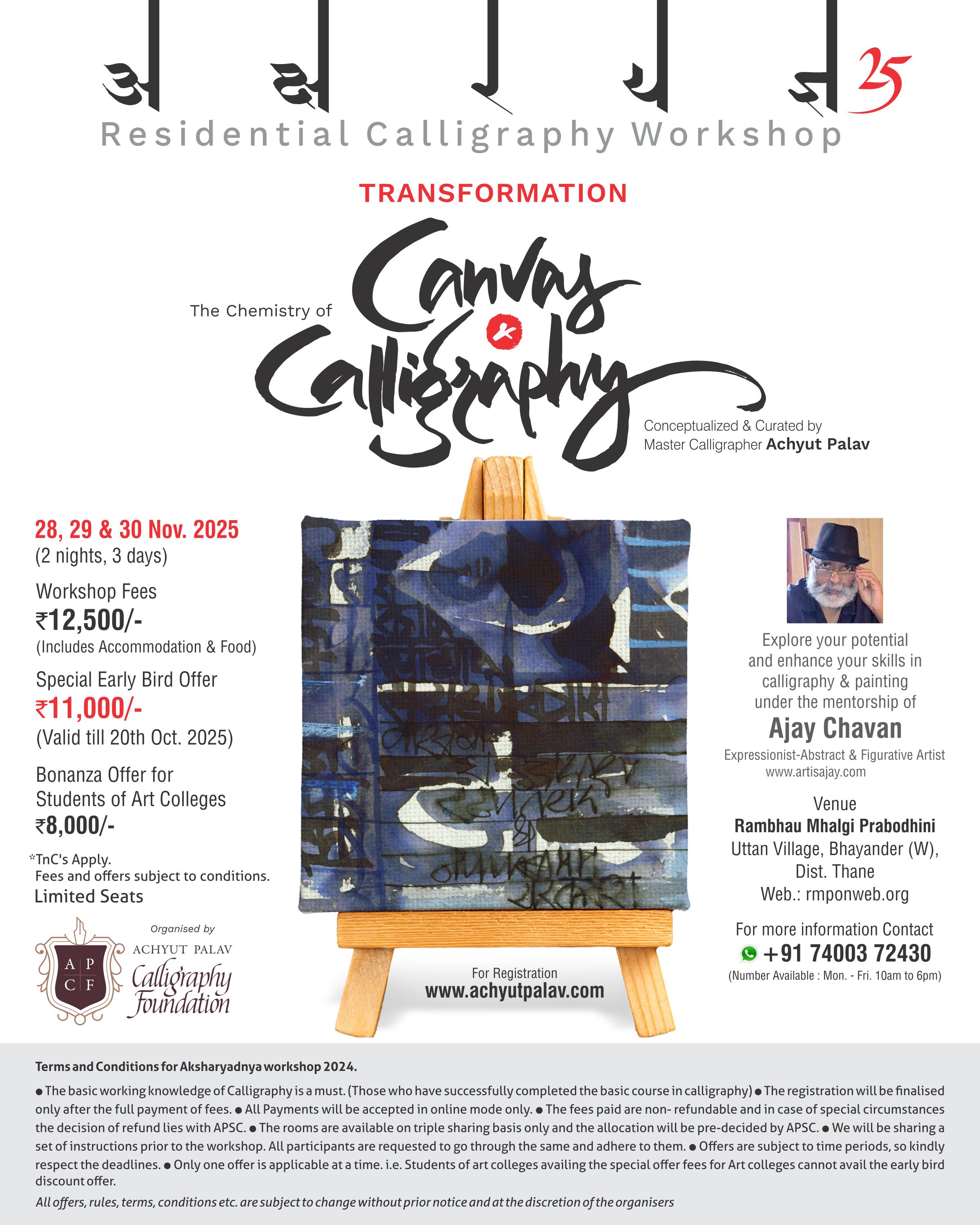 Any art form needs techniques and skills. But the art itself is beyond techniques. Art happens when the artist allows his true expression to flow freely through his mastery of technique. In the world of calligraphy, there is no better person than Achyut Palav sir, who can be said to be a true embodiment of free flowing expression and a complete mastery on techniques. There could be many teachers who teach you techniques. But it requires a true master to show how to let expressions flow through these techniques. Aspiring calligraphy artists are fortunate that Achyut Palav thought of creating APSC - a place of learning calligraphy. It's a Gurukul of calligraphy where the artist can learn calligraphy from scratch and take it all the way to professional level. This is a place where you meet wonderful calligraphy artists - each with their unique style, expression and journey. Once you become part of APSC family, it becomes a lifelong joyride through various courses, art exhibitions, workshops and various initiatives under the keen eye of Achyut sir.