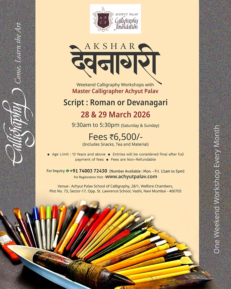 Venue: Achyut Palav School of Calligraphy, 28/1, Welfare Chambers, Plot No. 73, Sector-17, Opp. St. Lawrence School, Vashi, Navi Mumbai - 400705
